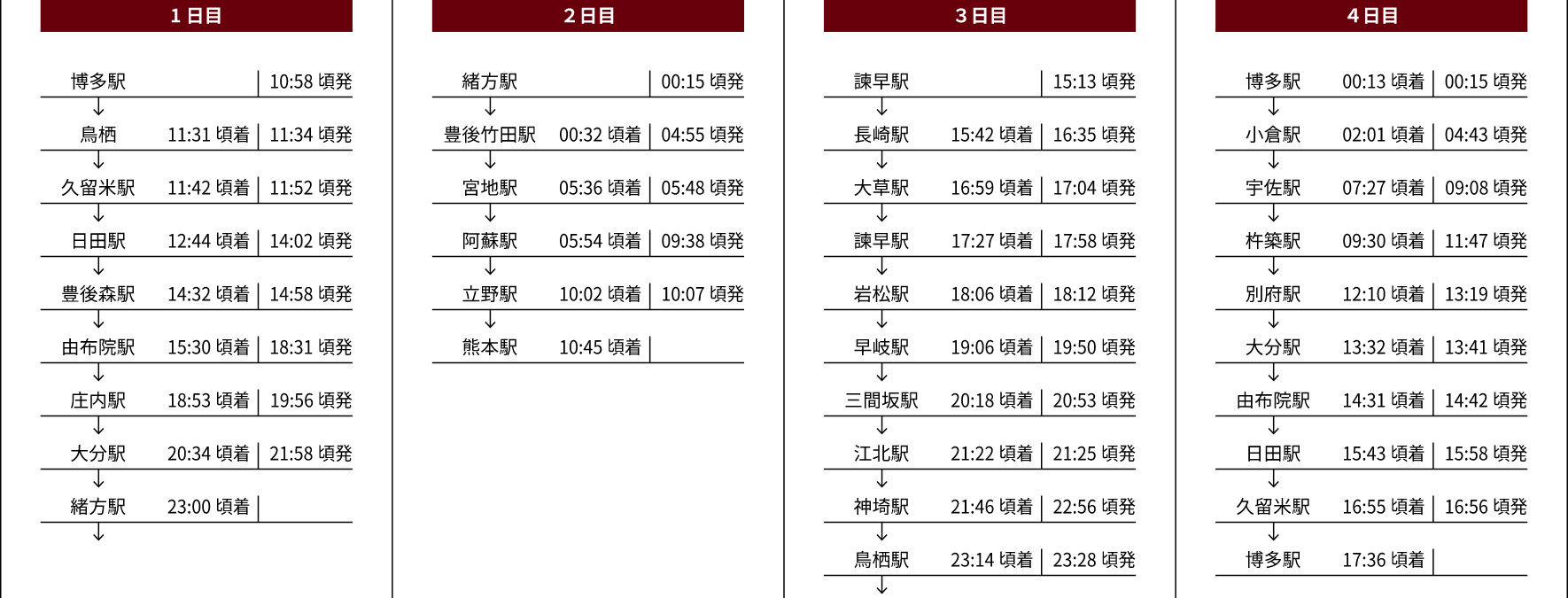 旅の締めくくりは再び由布岳を望む久大本線へ。この4日間の思い出を、流れゆく車窓に想い起こしながら、旅の終着駅・そして新たな人生のはじまりでもある博多駅へと向かいます。