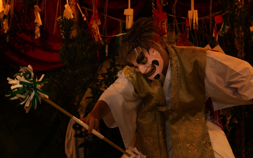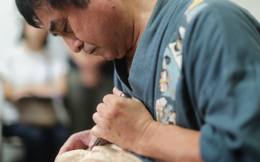 「高千穂の夜神楽」において、舞手がその身に神を宿す上で欠かせない神楽面。自らも夜神楽の舞手である神楽面彫師・工藤 浩章氏の工房へ赴き、木片から徐々に神々の表情を浮かびあがらせていく製作の様子を間近に見ながら、神楽面にかける思いをお話しいただきます。