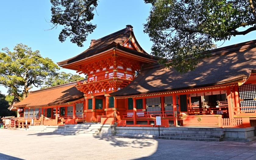 宇佐神宮は、大分県宇佐市に位置する全国4万社以上ある八幡社の総本宮で、1300年以上の歴史を誇る。国宝に指定された「八幡造」の本殿があり、全国に16社しかない天皇の使者である「勅使」が遣わされる「勅祭社」でもあるなど、非常に由緒ある厳かな雰囲気をお楽しみいただけます。かつて、宇佐神宮の再建には、当時小倉藩の細川忠興が尽力したとされ、1日目の八代焼につながる人物との再会も九州の旅の魅力ではないでしょうか。