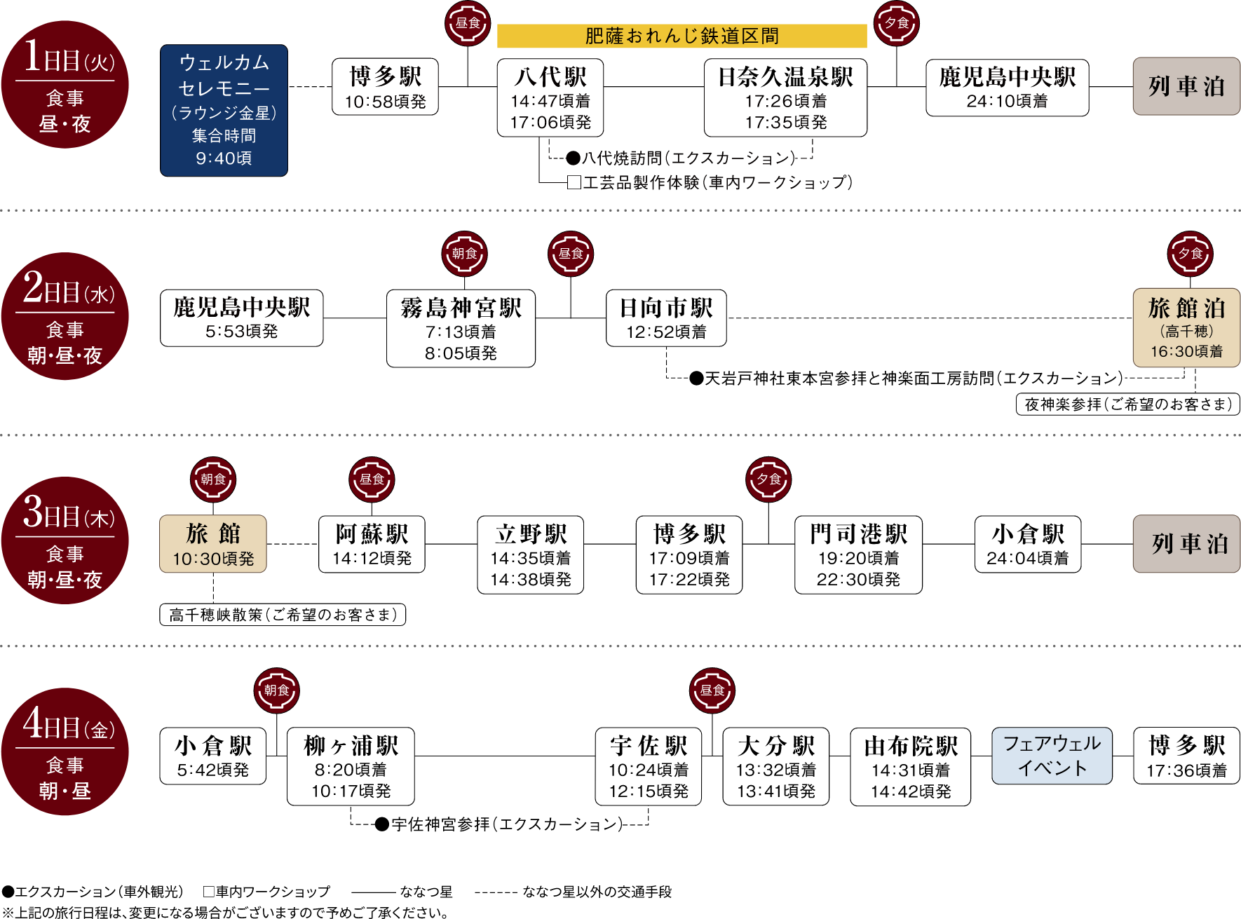 「ななつ星」は太平洋を望みながら、一路宮崎県・日向市へ。「ななつ星バス」に乗り換え訪れる日本神話に語られる天孫降臨の地・高千穂では、天岩戸神社や神楽の工房を訪問。夜神楽では「一夜氏子」として、その集落に伝わる舞いを観覧し、その伝統の守り手との交流も楽しめます。