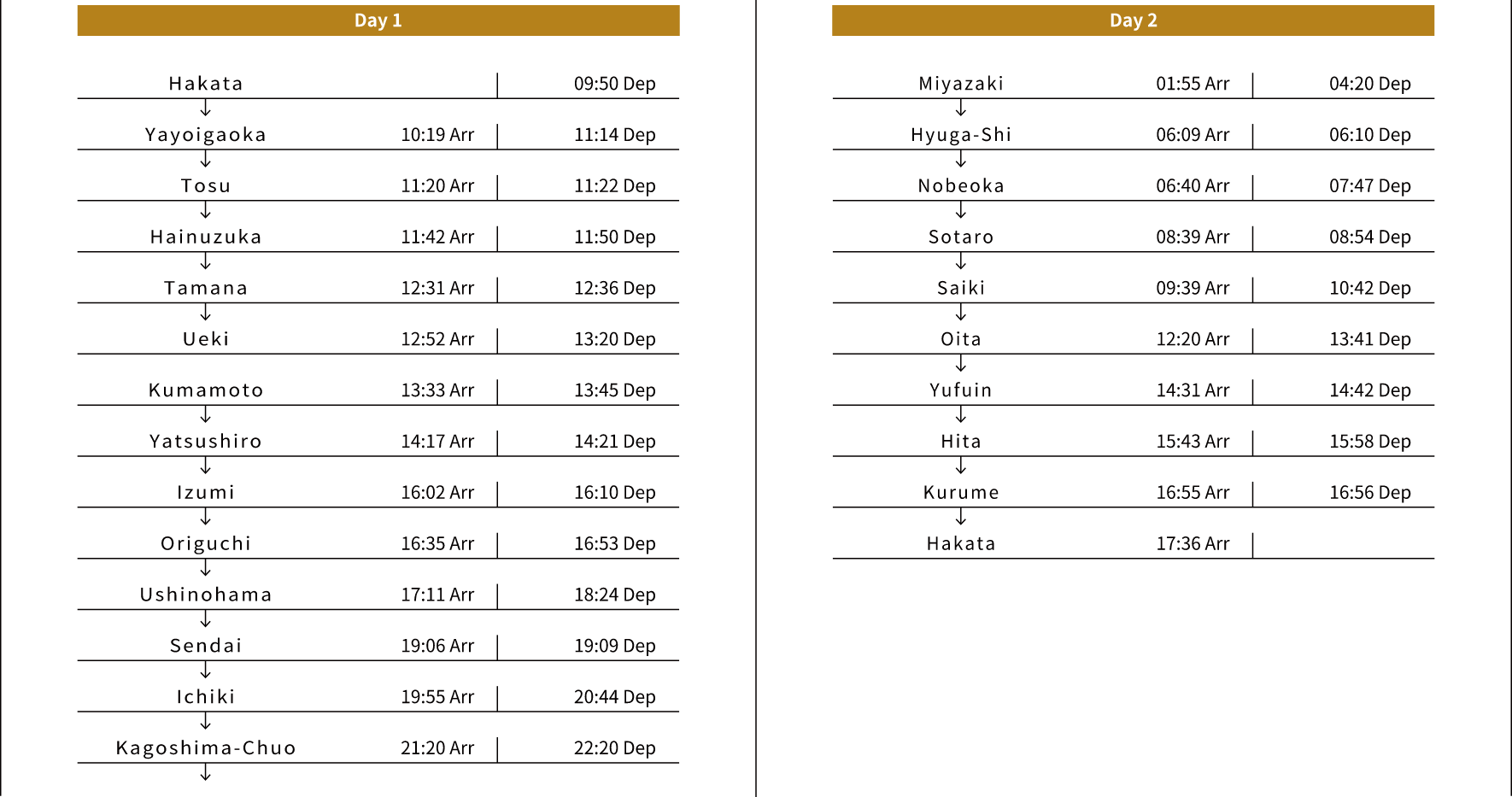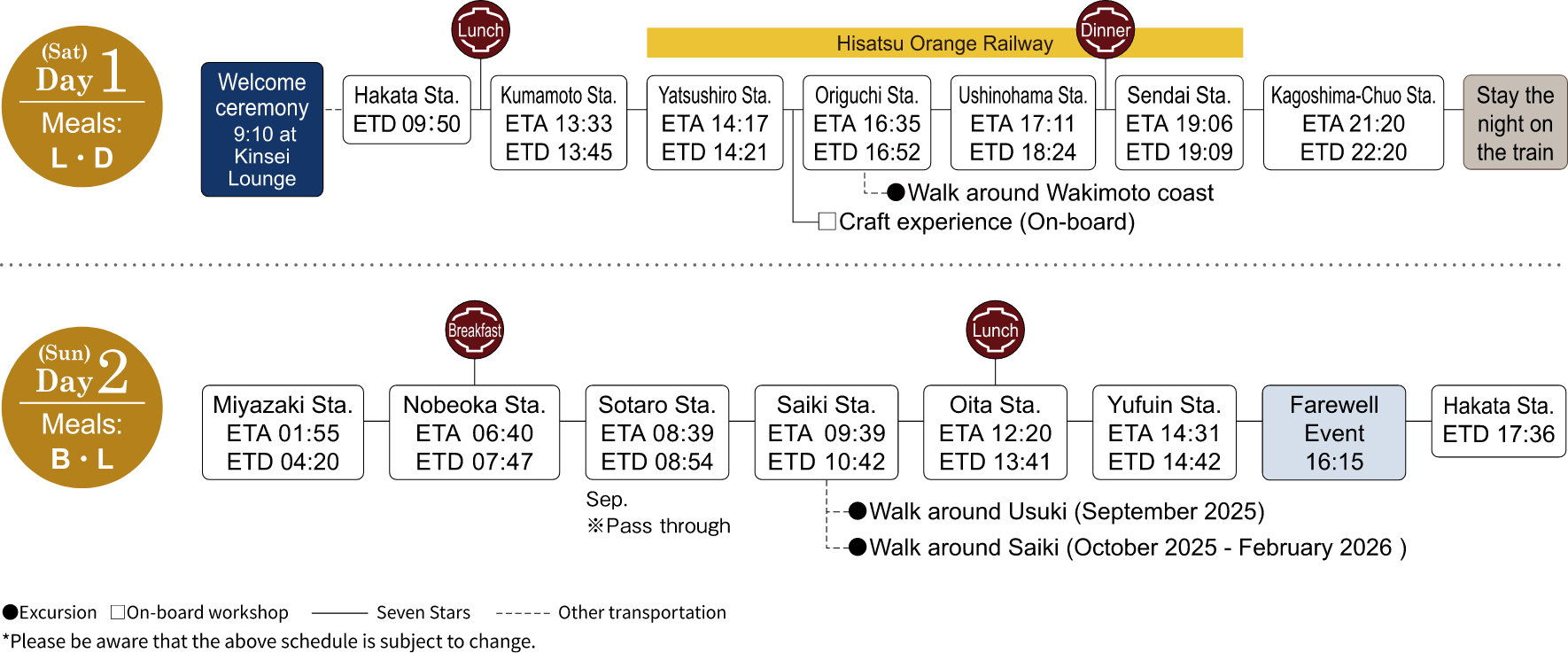 This is two days journey around Kyushu and you can experience richness of spending time on the Seven Stars. This journey brings you relaxing moments in the changing scenery through the train windows. The sunset over the East China Sea from the Hisatsu Orange Railway will be a memorable. Communicating with local people in small coastal towns, the west and east of Kyushu, will surely warm your heart.