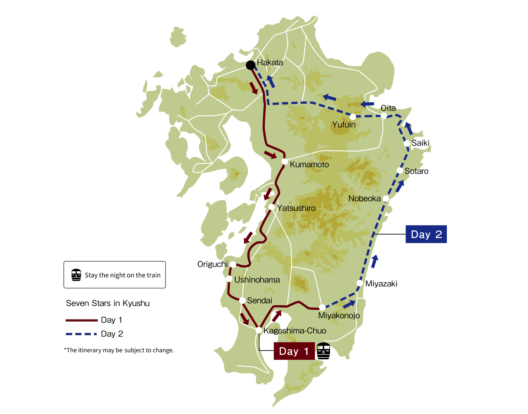 Upon departing from Hakata station, the Seven Stars heads for Kagoshima, the southern Kyushu area.