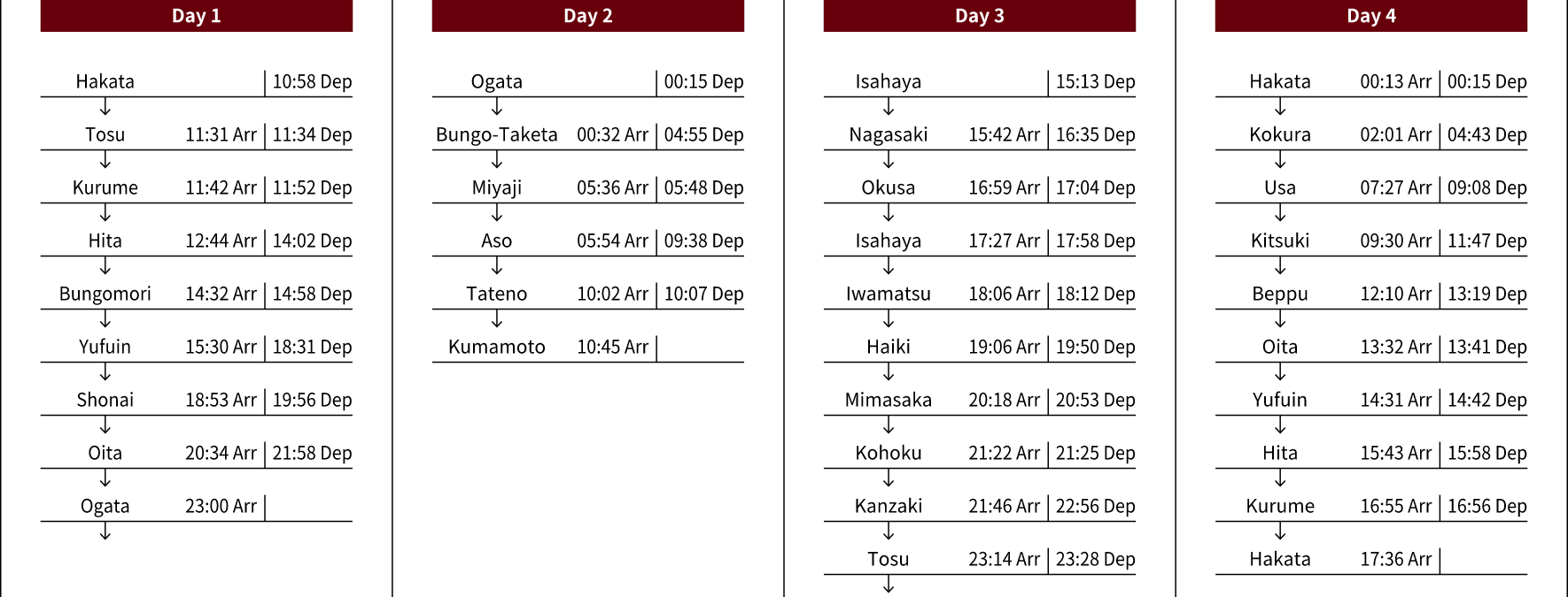 In the last part of the journey, you will return to views of Mt. Yufu on the Kyudai Main Line. You will recall your memories of the four-day journey as the scenes flow past the train windows on your way to Hakata Station, which is the final destination and a new starting point for your life.