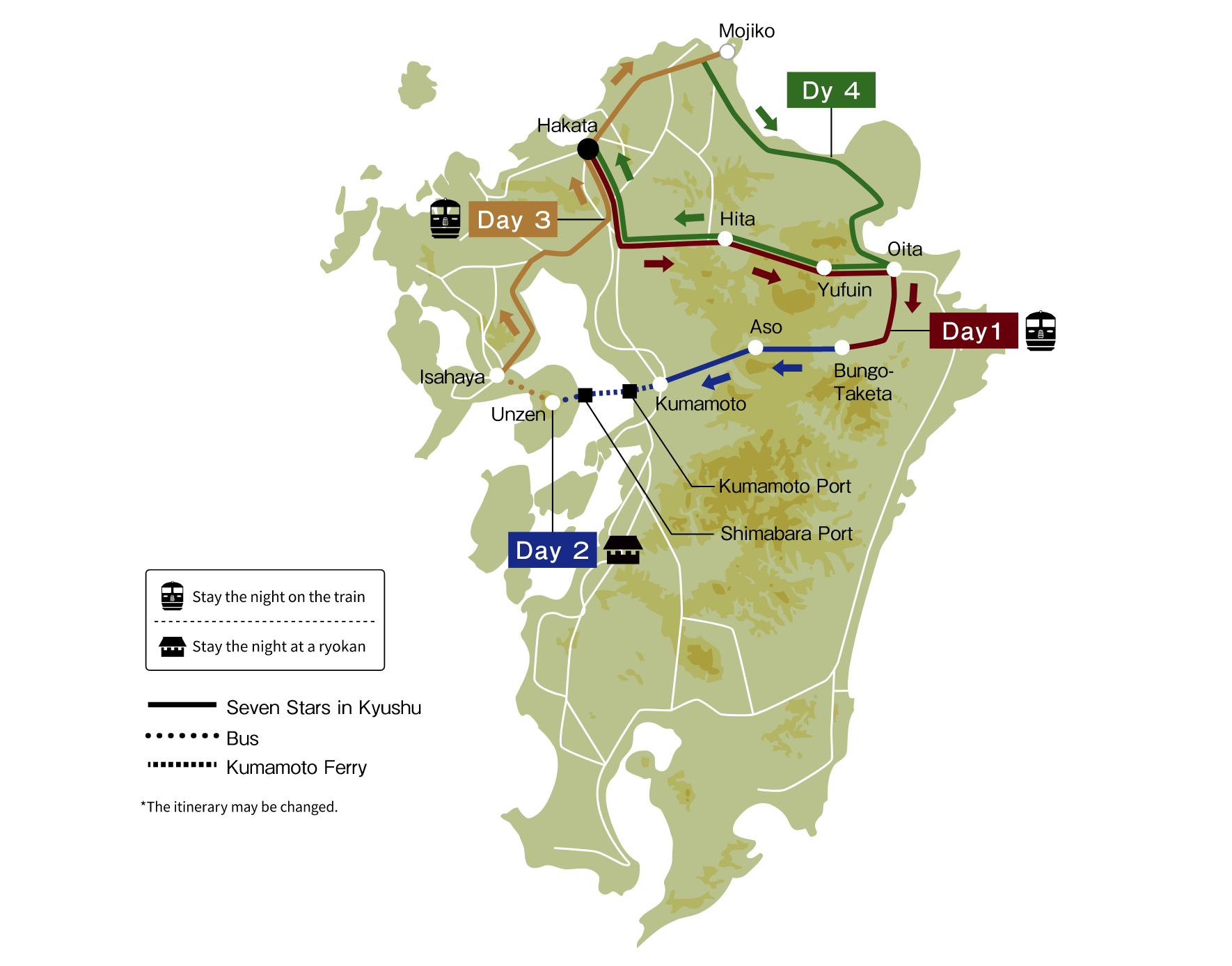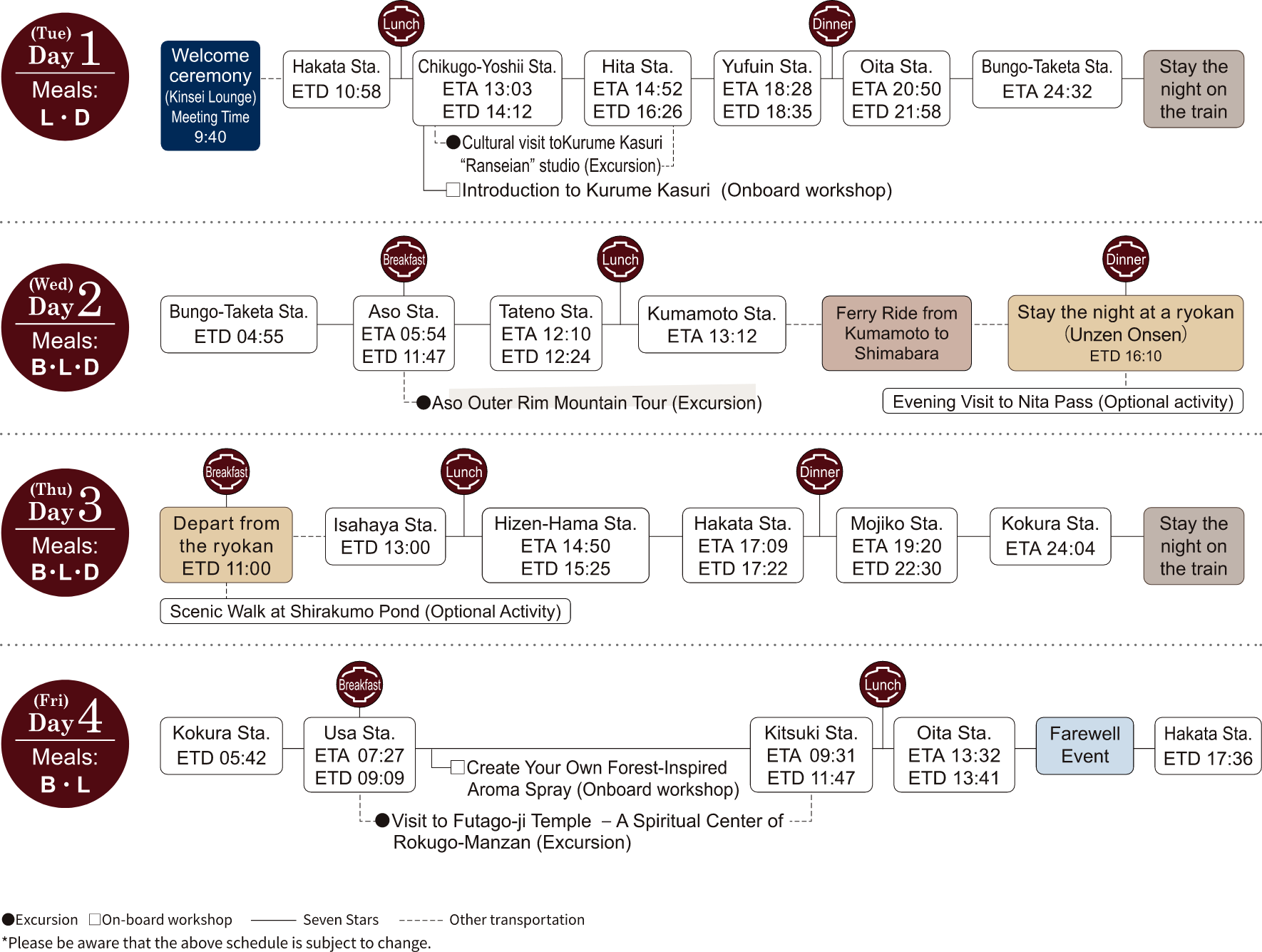 Onboard, you are invited to indulge in a culinary experience found nowhere else: a refined expression of Kyushu’s essence, crafted exclusively for the train. Each dish is a celebration of the land, the people, and the spirit of hospitality that defines this extraordinary journey. (Lunch) -