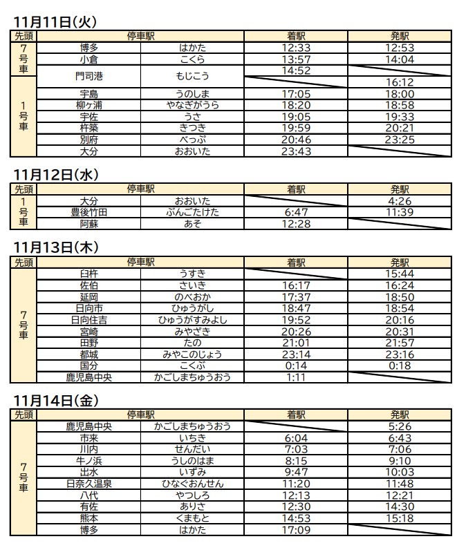 【お知らせ】「ななつ星in九州」2025年11月11日(火)運行分 ルート変更および運転時刻のご案内